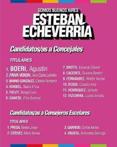 La lista de Somos en Esteban Echeverría estará encabezada en primer lugar por Agustín Boeri, quien estará acompañado por Ana Paiva Verón;  Cristian González Banno; Nadia Kunkel;  Sergio Foley y Elba Danese, en los primeros seis lugares.