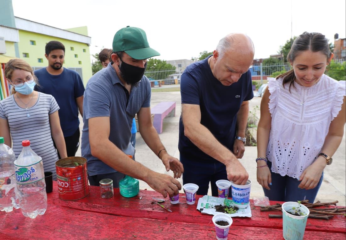 En Villa Jardín los jóvenes participantes del proyecto, en su mayoría del barrio y del grupo Alta Movida del Municipio de Lanús, acompañaron la presencia de Grindetti y Angeletti y desempeñaron sus actividades de preparación del sustrato, plantación de semillas y plantines, como así también técnicas de separación para su reproducción.