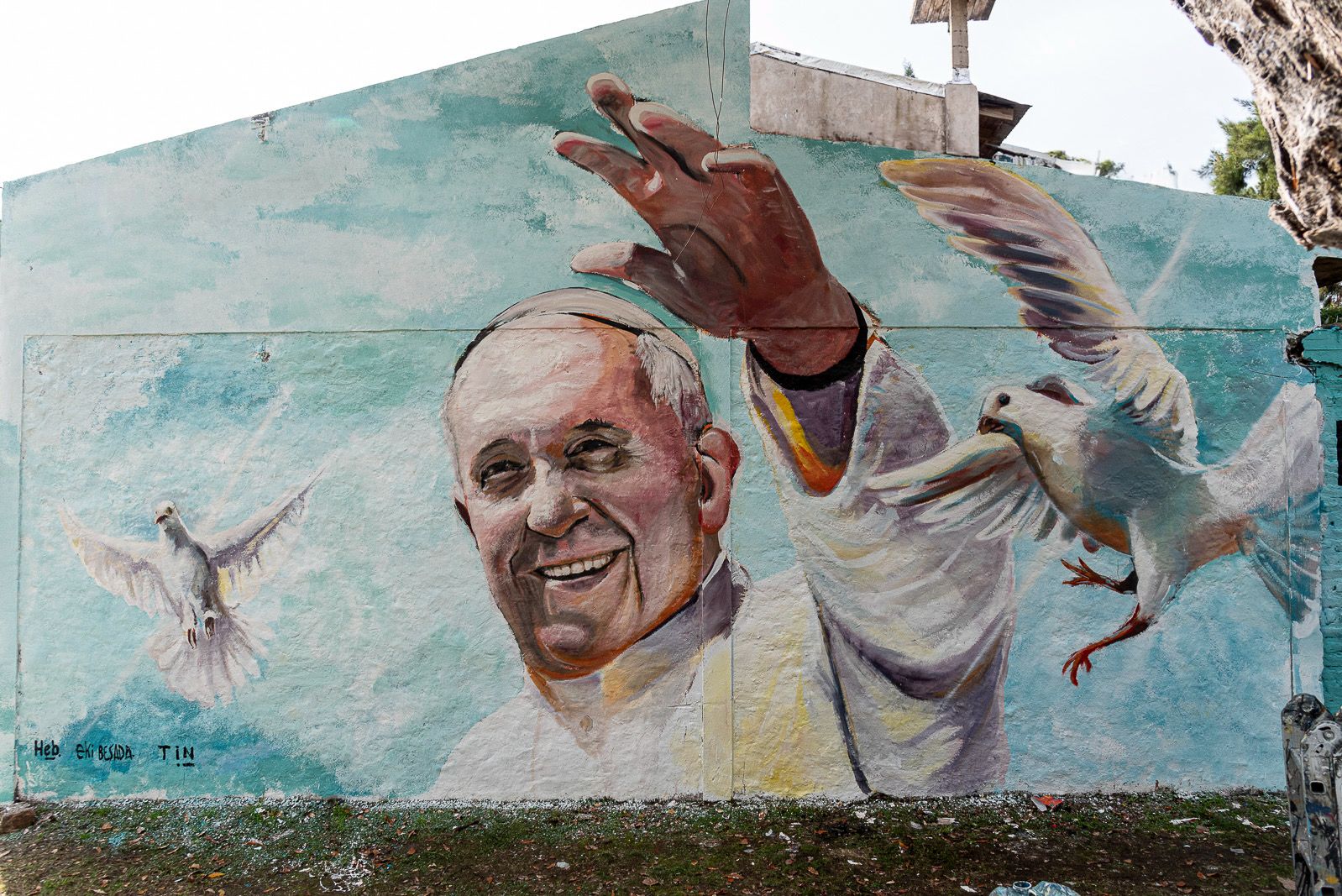 Allí en el mural luce la imborrable y majestuosa figura del Sumo Pontífice. La imagen también está acompañada de dos palomas blancas y un cielo con los colores de nuestro pabellón nacional.